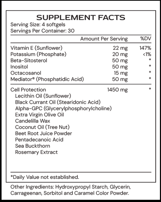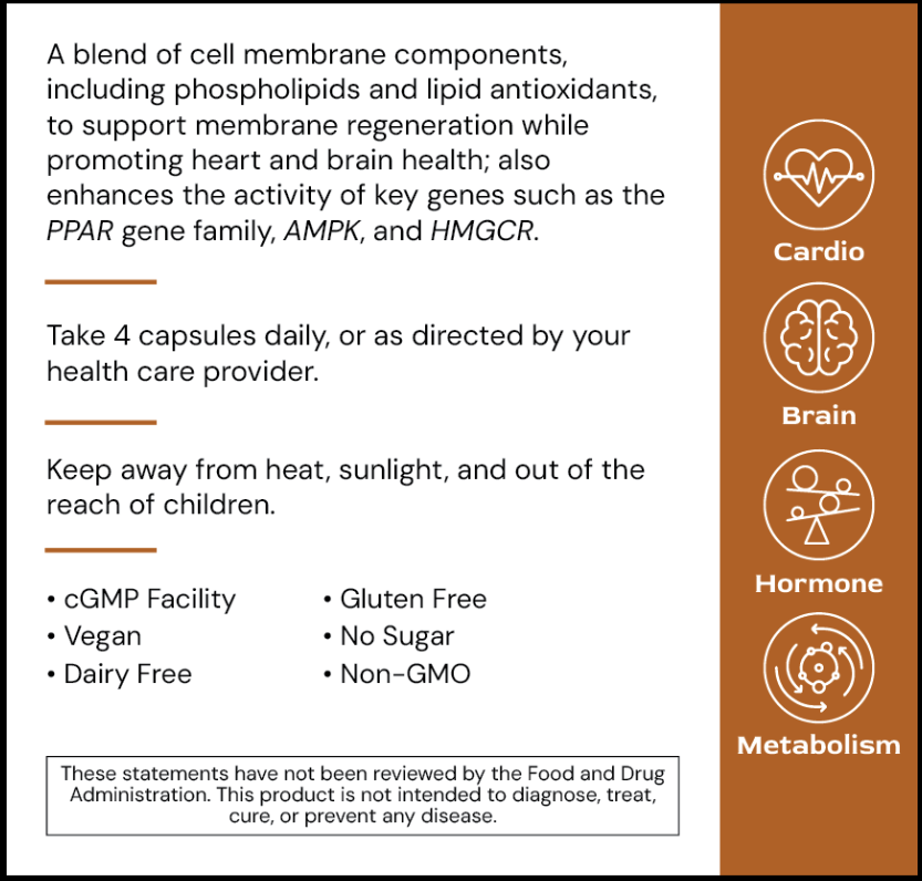 A blend of cell membrane components, including phospholipids and lipid antioxidants, to support membrane regeneration while promoting heart and brain health; also enhances the activity of key genes such as the PPAR gene family, AMPK, and HMGCR.